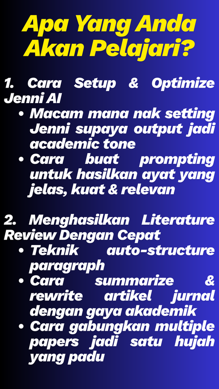 Dengan Jenni AI , semua proses ini boleh dipercepatkan secara sistematik, tanpa plagiarism dan tanpa hilang suara akademik anda .